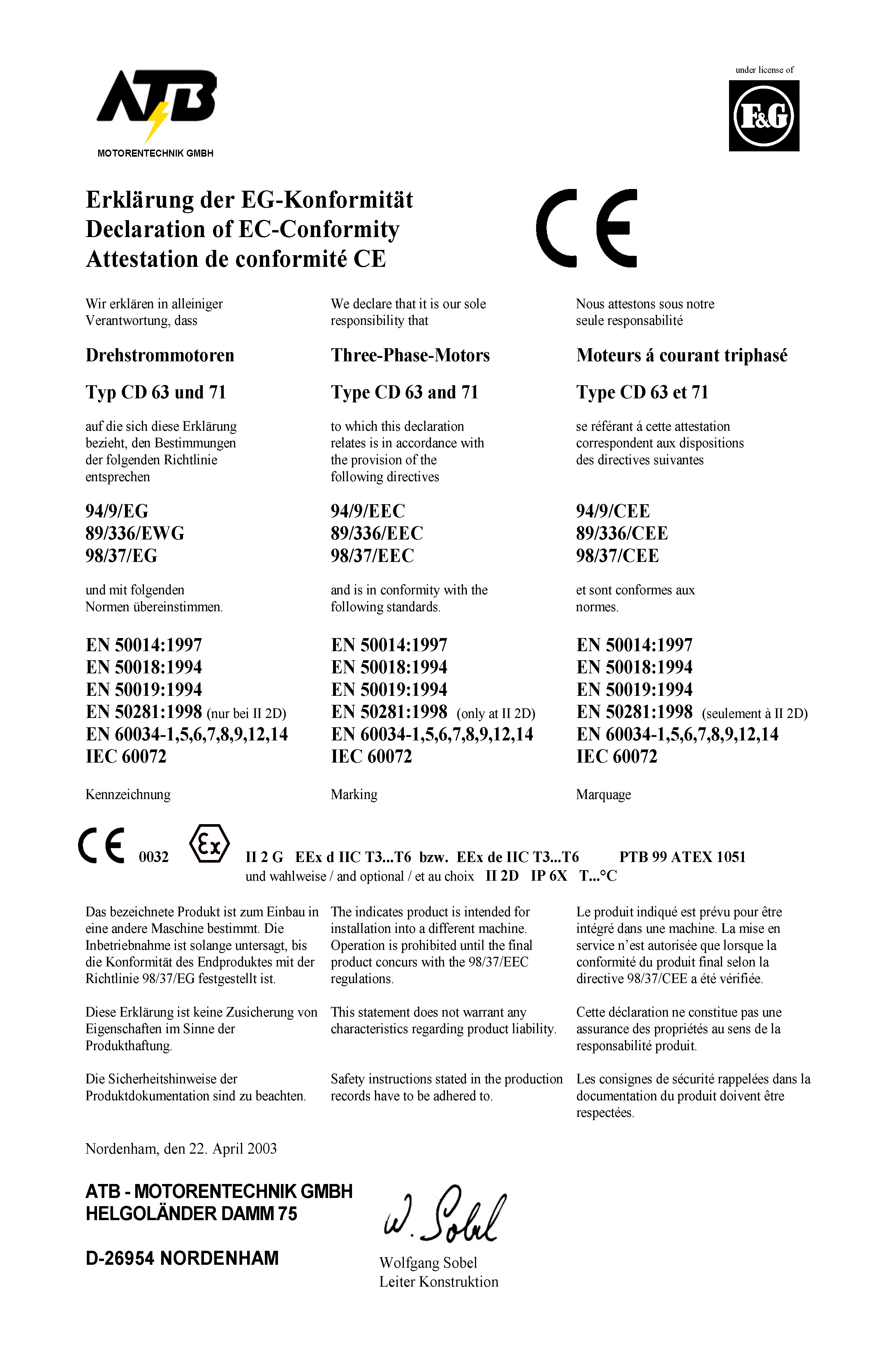 EG-Baumusterprüfbescheinigung - ATEX 2G| F&G Motoren CD56-CD315, dCD63-dCD355 - EEx d IIC T3...T6 | Eex de IIC T3...T6