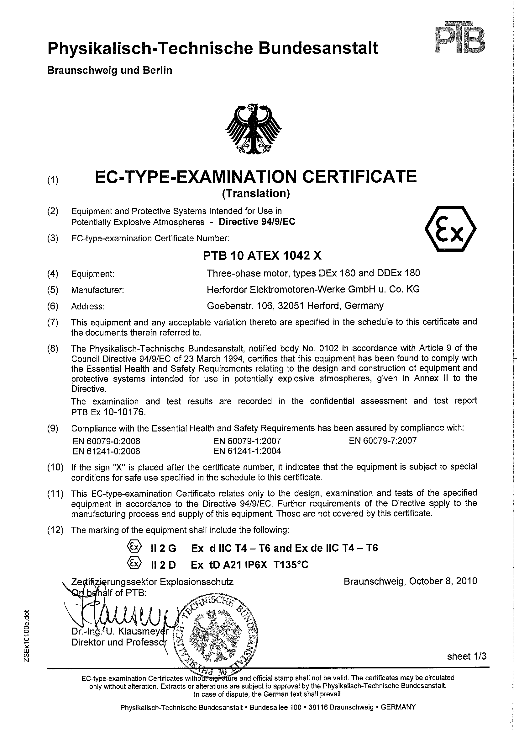 EC-type examination certificate + data sheet – ATEX 2G+3G | HEW motors – Gas explosion protection, size: 180