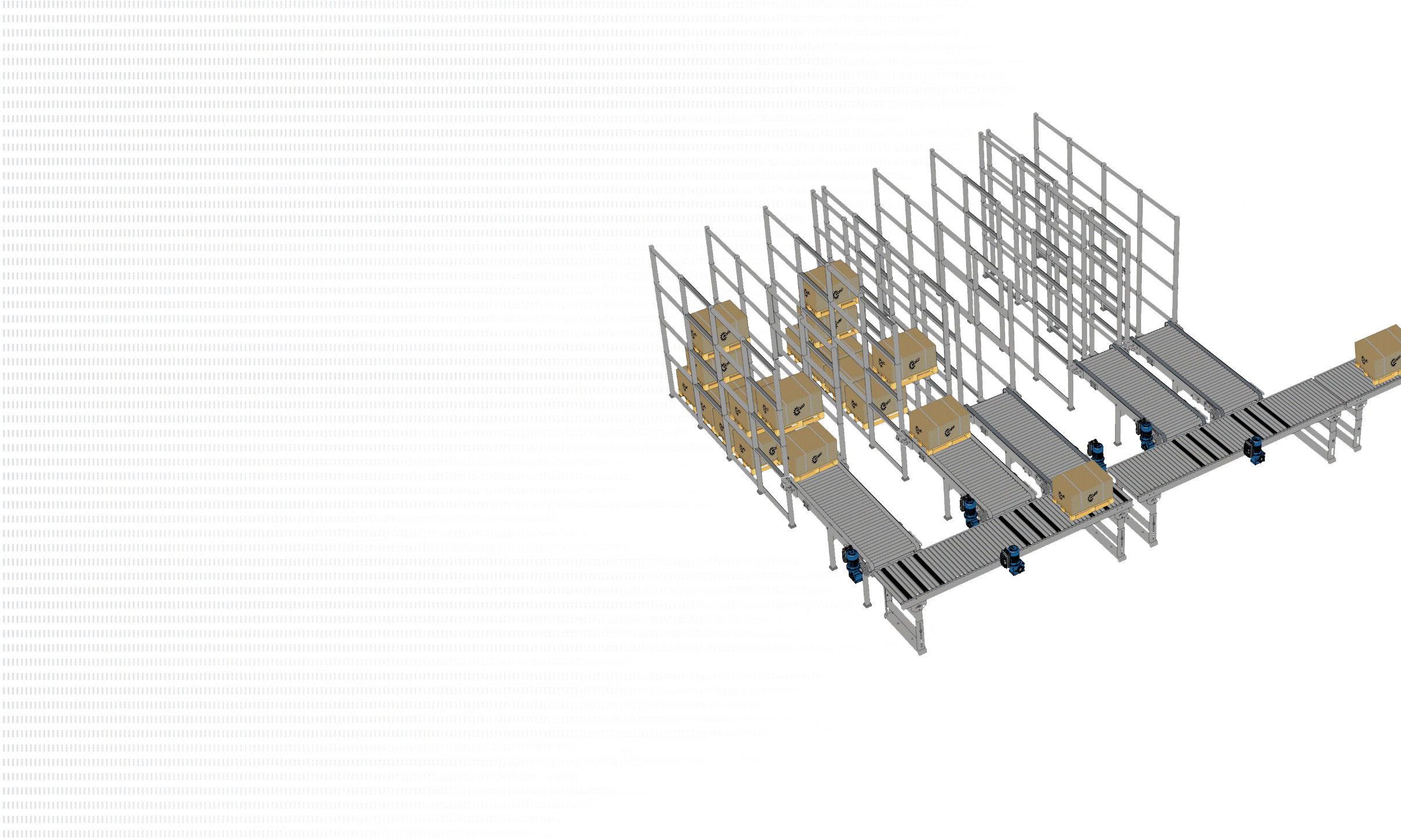 A corner transfer conveyor is a combination of roller and chain conveyors that performs a 90° change of direction. By lifting or lowering the chain, chain conveyors receive or transfer unit loads.