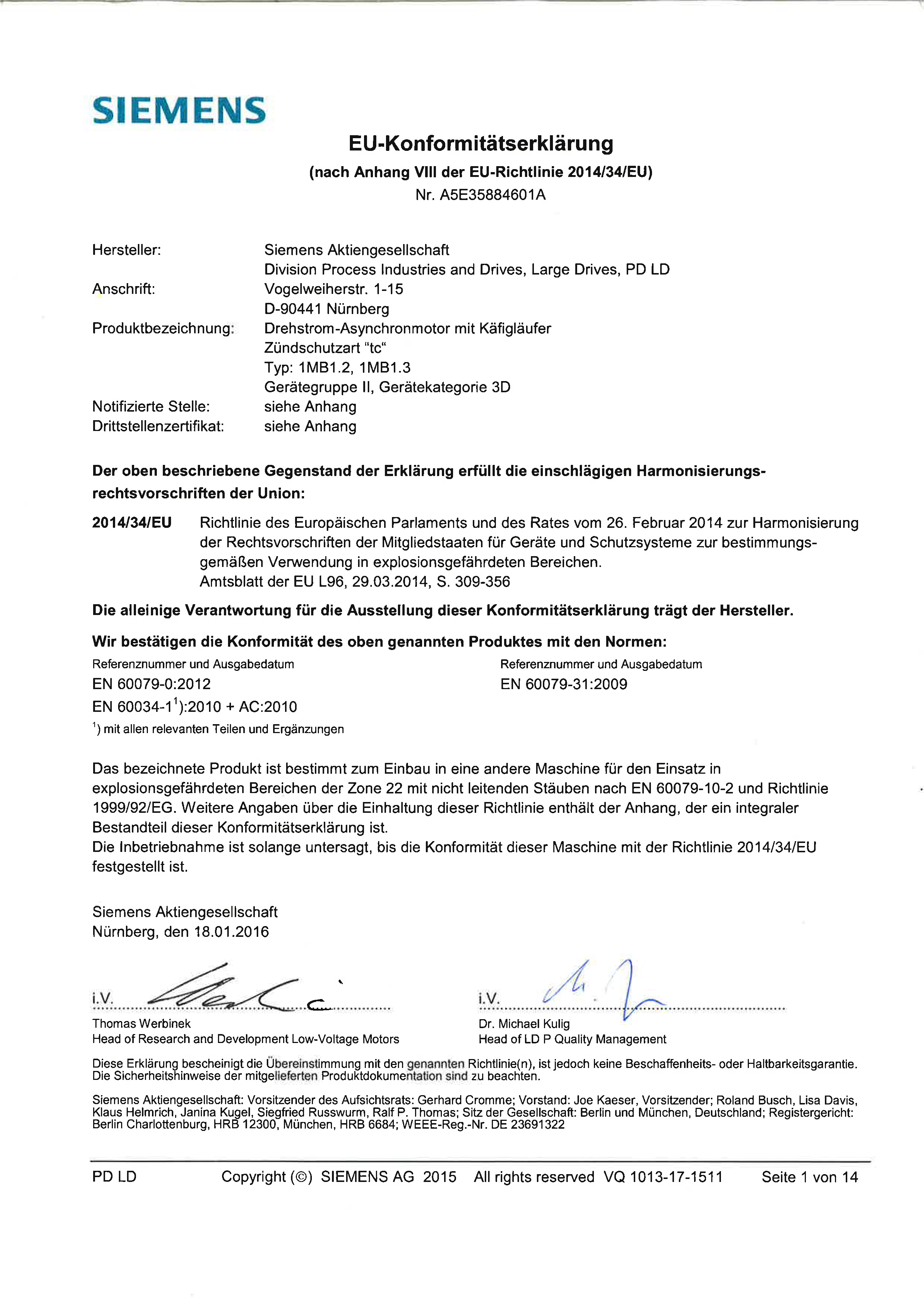 EU-vaatimuksenmukaisuusvakuutus - ATEX 3D| Siemens-moottorit - pölyräjähdyssuojaus, rakennesarja: 1MB